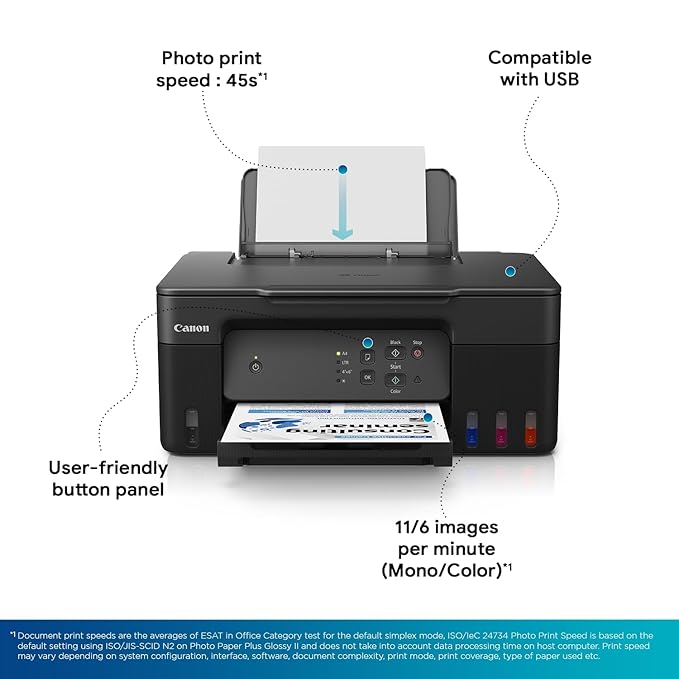 - Page size: A4, A5, A6, B5, LTR, LGL, Executive, Oficio2, B-Oficio, M-Oficio, Legal (India), Foolscap, F4, 4 x 6″, 5 x 7″, 7 x 10″, 8 x 10″, Envelopes , Square, Card Size ,Custom Size- Width: 55 – 216 mm, Length: 89 – 1,200 mm; Max paper thickness: 64 to 275 GSM ; Maximum Input Sheet Capacity: 100 sheets (A4); Compatible ink:GI 71 Cyan, Magenta, Yellow, Black; Additional Printer Function:, Print modes- Standard and Economy ; Power wattage of printer: OFF: 0.1W, Standby (scanning lamp is off):0.6W, Printing (USB connection to PC): 14W