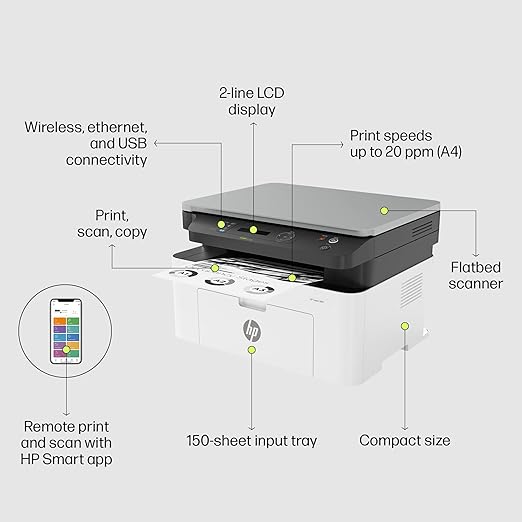 - “COMPACT DESIGN : Surprisingly small size, exceptional print quality; AFPORDABLE PRINTING: Rely on a high-performance laser printer at an affordable price RELIABLE CONNECTIVITY: 1 Wi-Fi 802.11b/g/n; 2 Hi-Speed USB 2.0 (device); Ethernet 10/100 Base-TX RELIABLE HP QUALITY : Produce sharp text, bold blacks and crisp graphics”