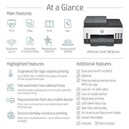 - 【All-in-One printer】Streamline your workflow with this all-in-one – print, copy, scan, fax HP Smart Tank printer that elevates your projects with vivid color prints and dependable flatbed scanning.